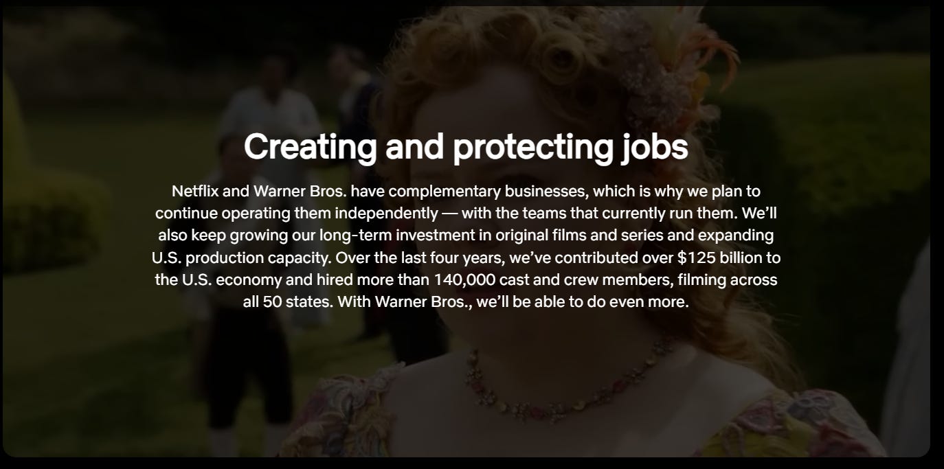 “We’ll also keep growing our long-term investment in original films and series and expanding U.S. production capacity. Over the last four years, we’ve contributed over $125 billion to the U.S. economy and hired more than 140,000 cast and crew members, filming across all 50 states. With Warner Bros., we’ll be able to do even more,” the company concluded.