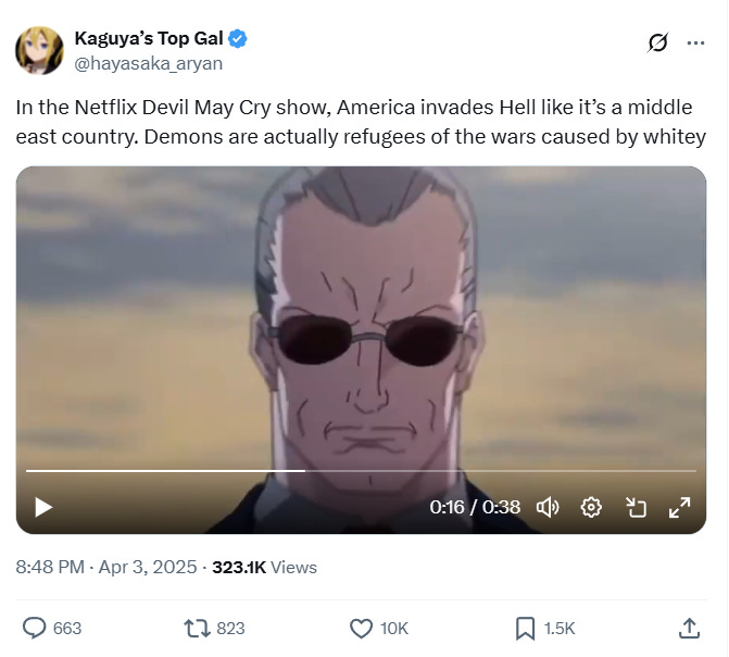 Kaguya’s Top Gal also bashed the show writing, “In the Netflix Devil May Cry show, America invades Hell like it’s a middle east country. Demons are actually refugees of the wars caused by whitey.”