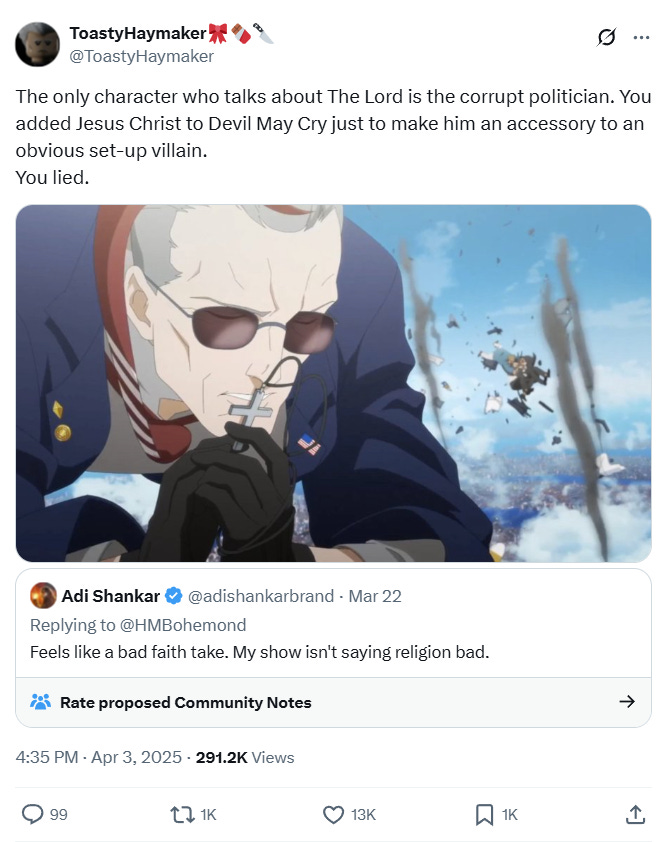 ToastyHaymaker responded to Shankar’s post above writing, “The only character who talks about The Lord is the corrupt politician. You added Jesus Christ to Devil May Cry just to make him an accessory to an obvious set-up villain. You lied.”
