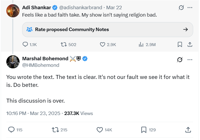 Shankar replied to the observation writing, “Feels like a bad faith take. My show isn't saying religion bad.”