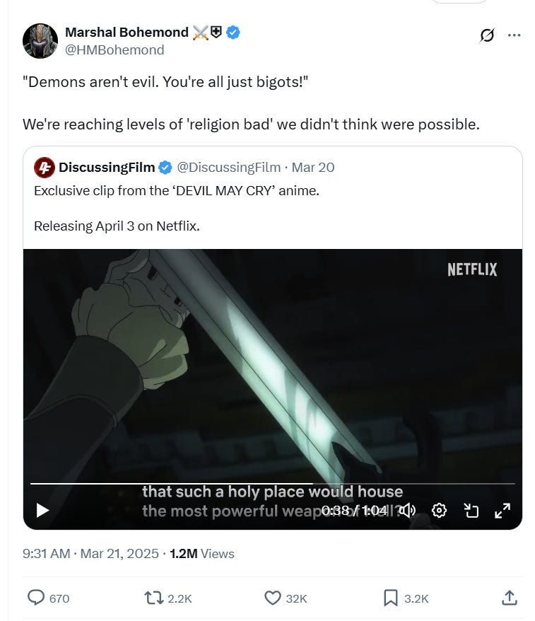 X user Marshal Bohemond expressed his opinion paraphrasing a portion of the clip, “Demons aren’t evil. You’re all just bigot!” He then added, “We’re reaching levels of ‘religion bad’ we didn’t think were possible.”