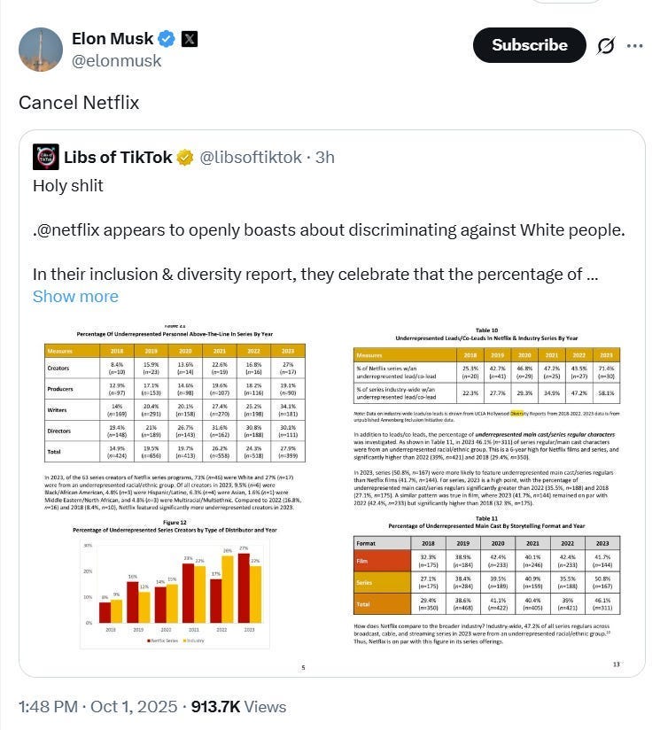 In another post he referenced Netflix’s DEI policies that appeared to discriminate against white people. He wrote “Cancel Netflix.”