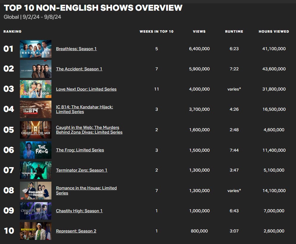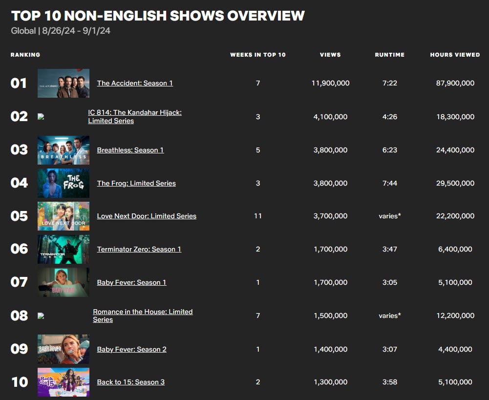 On the the week of the show’s release back in August 2024 it charts on Netflix’s Top 10 Non-English shows with 1.7 million views and 6.4 million hours viewed.