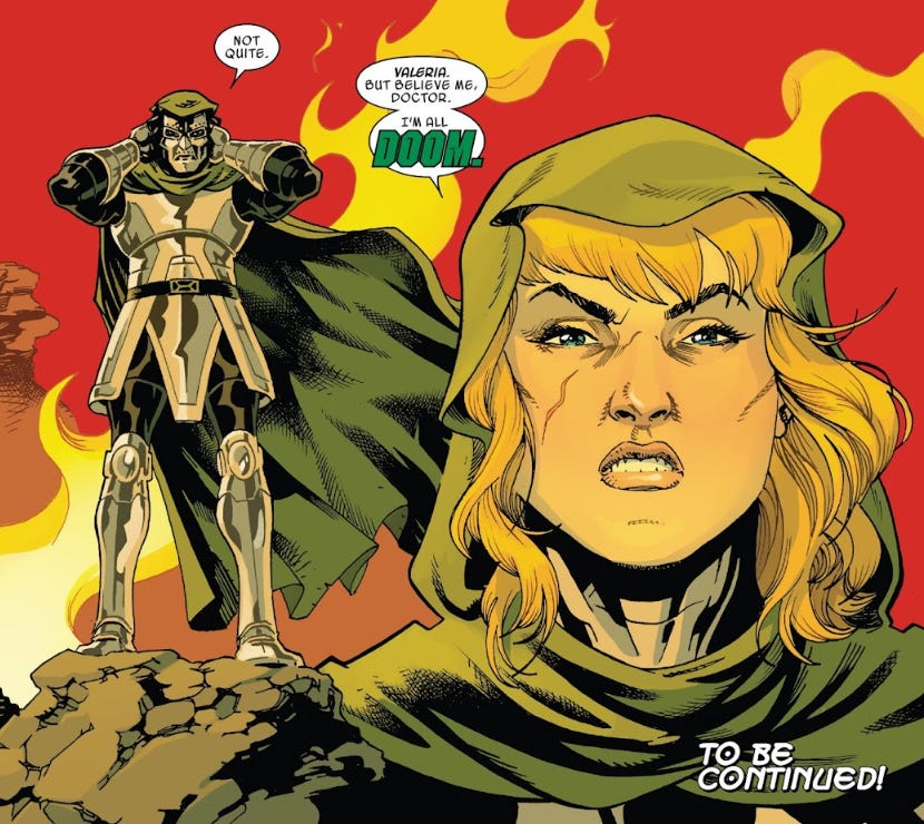 Rocha then speculated, “It could be another Doom, a Doom variant with a female Doom variant who could be that version of Sue Richards in that universe. But, yes, a female sidekick.”