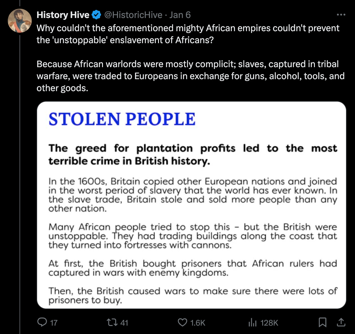 “Why couldn't the aforementioned mighty African empires couldn't prevent the 'unstoppable' enslavement of Africans? Because African warlords were mostly complicit; slaves, captured in tribal warfare, were traded to Europeans in exchange for guns, alcohol, tools, and other goods.”
