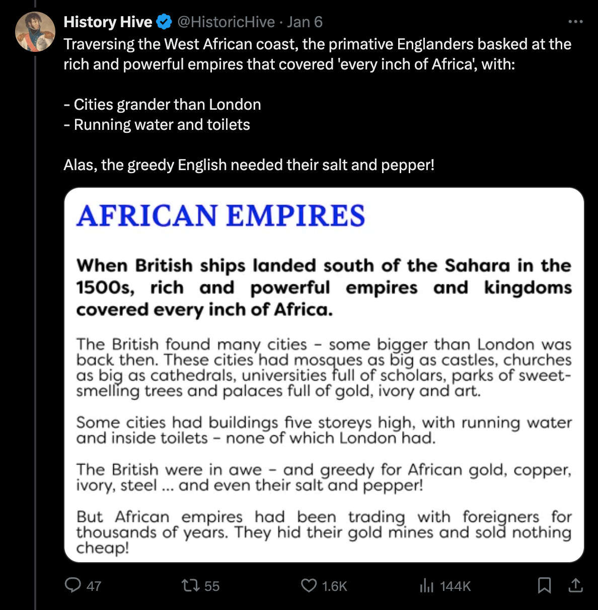 “Traversing the West African coast, the primative Englanders basked at the rich and powerful empires that covered 'every inch of Africa', with: - Cities grander than London - Running water and toilets Alas, the greedy English needed their salt and pepper!”