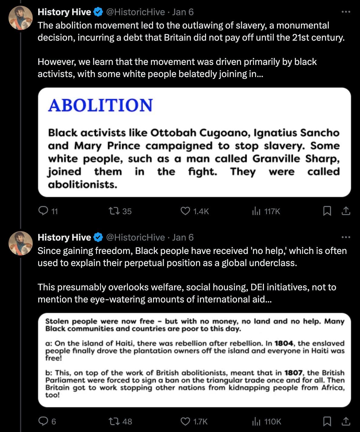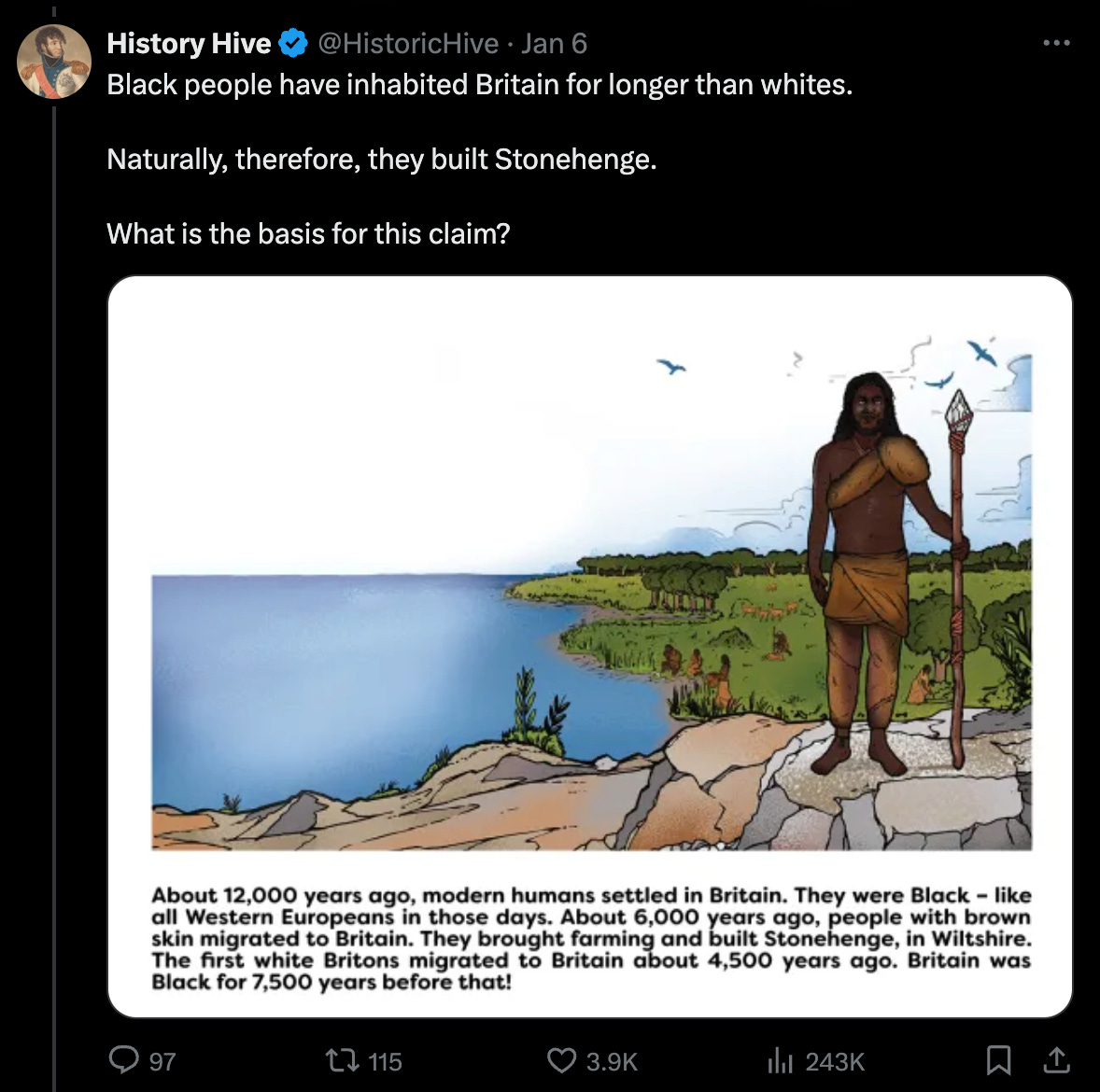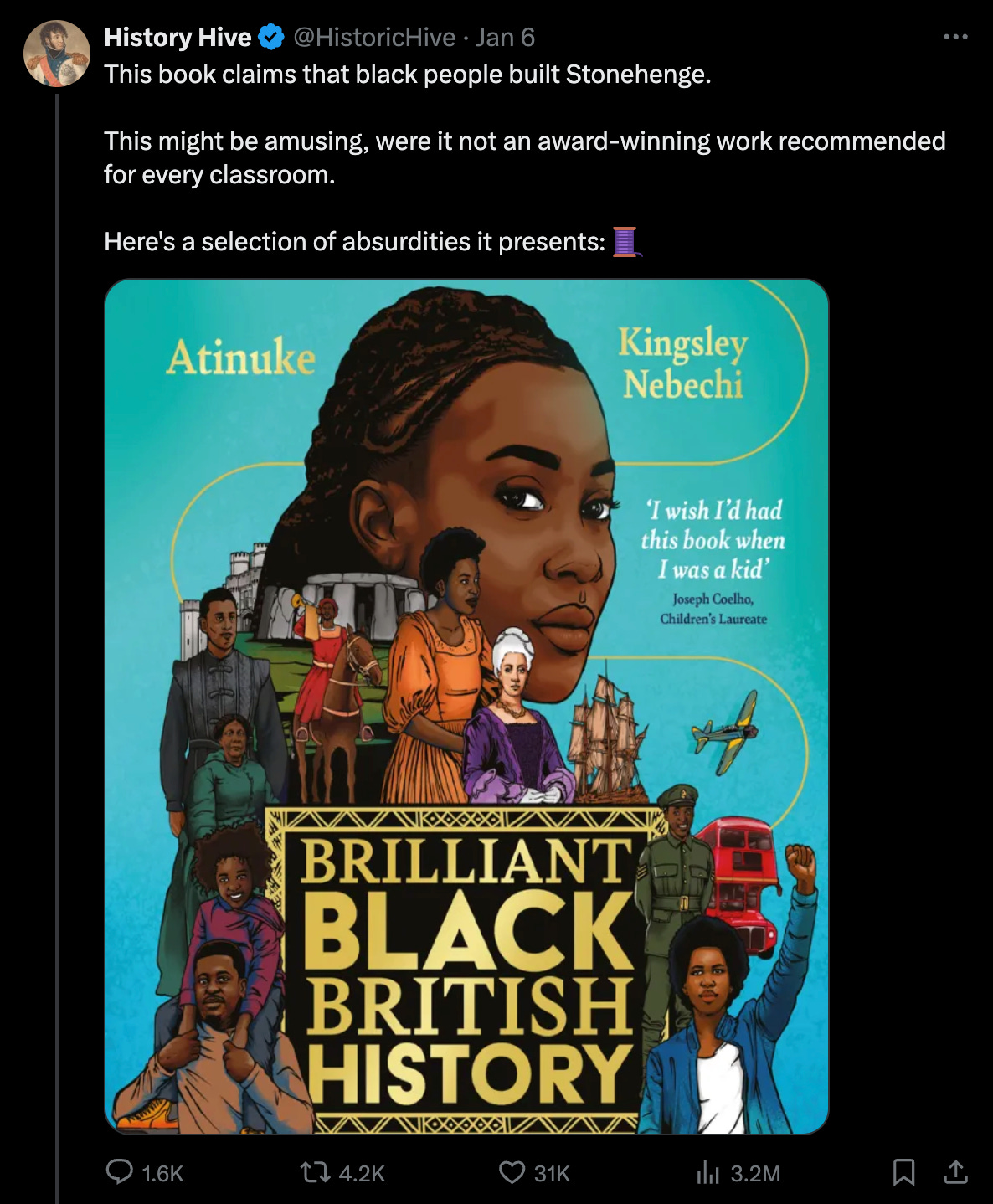 Now, a new history book, Brilliant Black British History, was exposed on X by the account History Hive as completely making up black history as a demonstration of how corrupt the publishing industry has become. He posted along with the cover, “This book claims that black people built Stonehenge. This might be amusing, were it not an award-winning work recommended for every classroom. Here's a selection of absurdities it presents.”