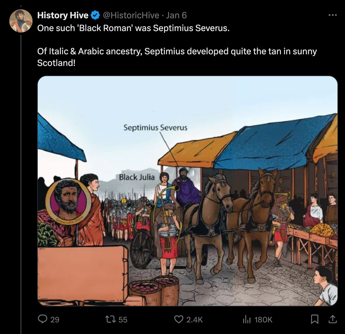 “One such 'Black Roman' was Septimius Severus. Of Italic & Arabic ancestry, Septimius developed quite the tan in sunny Scotland!”