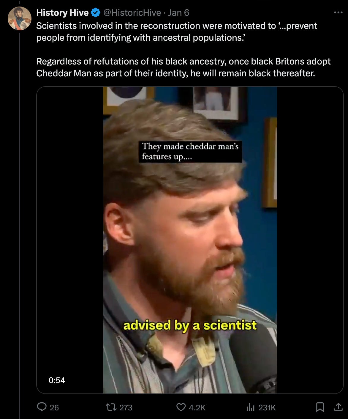 “Scientists involved in the reconstruction were motivated to ‘...prevent people from identifying with ancestral populations.’ Regardless of refutations of his black ancestry, once black Britons adopt Cheddar Man as part of their identity, he will remain black thereafter.”