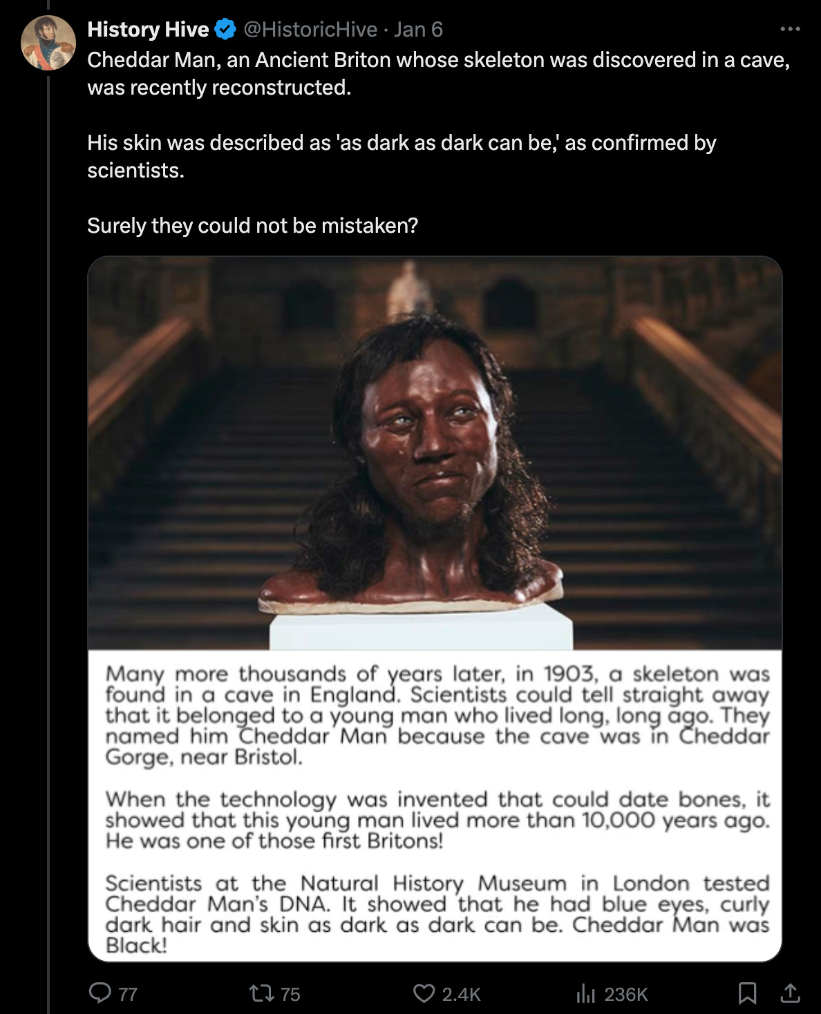 .“Cheddar Man, an Ancient Briton whose skeleton was discovered in a cave, was recently reconstructed. His skin was described as 'as dark as dark can be,' as confirmed by scientists. Surely they could not be mistaken?”
