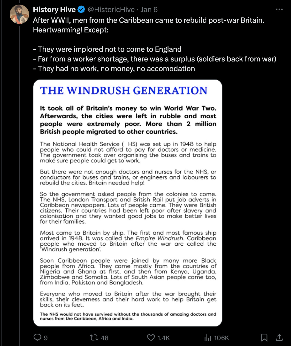 “After WWII, men from the Caribbean came to rebuild post-war Britain. Heartwarming! Except: - They were implored not to come to England - Far from a worker shortage, there was a surplus (soldiers back from war) - They had no work, no money, no accommodation”