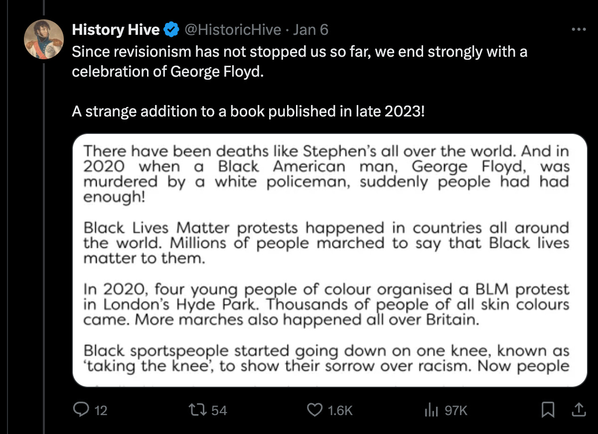 “Since revisionism has not stopped us so far, we end strongly with a celebration of George Floyd. A strange addition to a book published in late 2023!” he concluded.