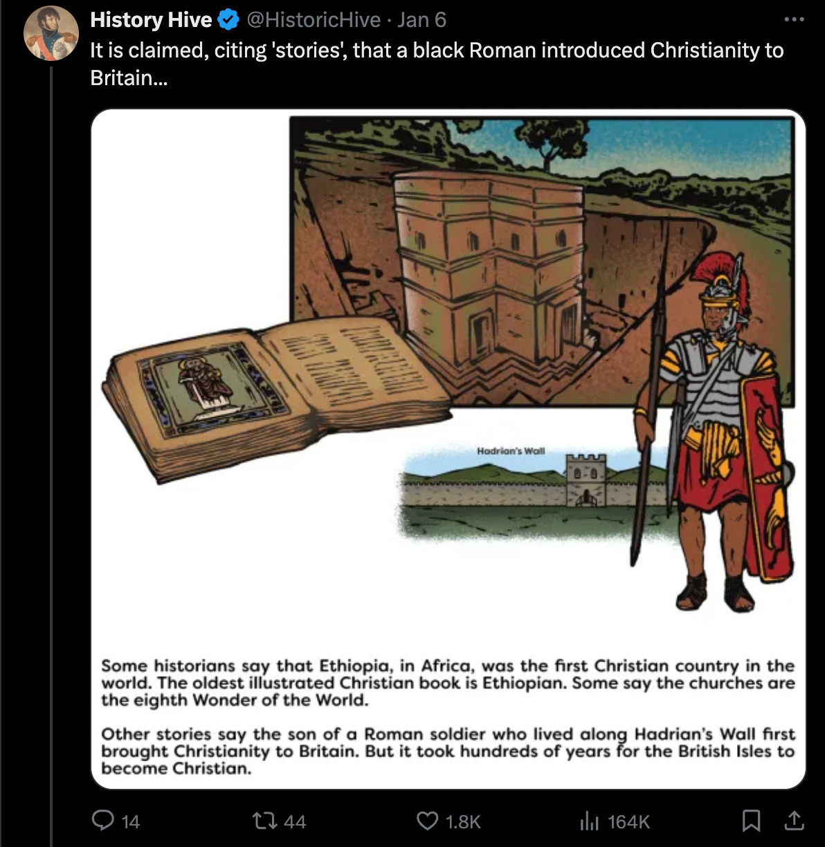 “It is claimed, citing 'stories', that a black Roman introduced Christianity to Britain...”