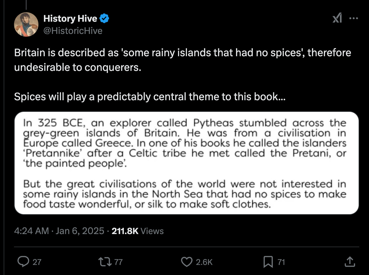 “Britain is described as 'some rainy islands that had no spices', therefore undesirable to conquerers. Spices will play a predictably central theme to this book...”