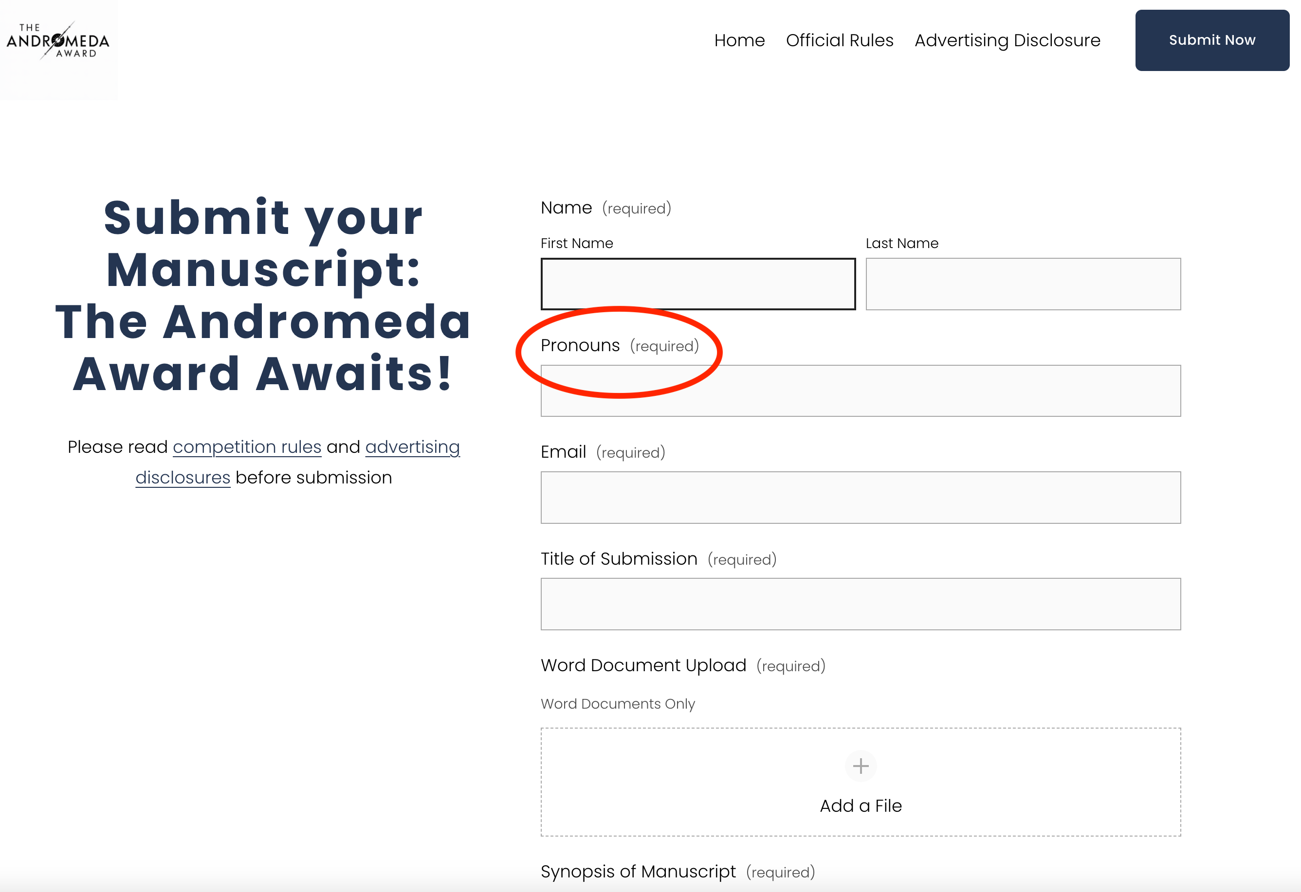 However, politics is already being played in this award’s submission process. When someone logs in to submit their work, a field requesting pronouns shows—and it is required.