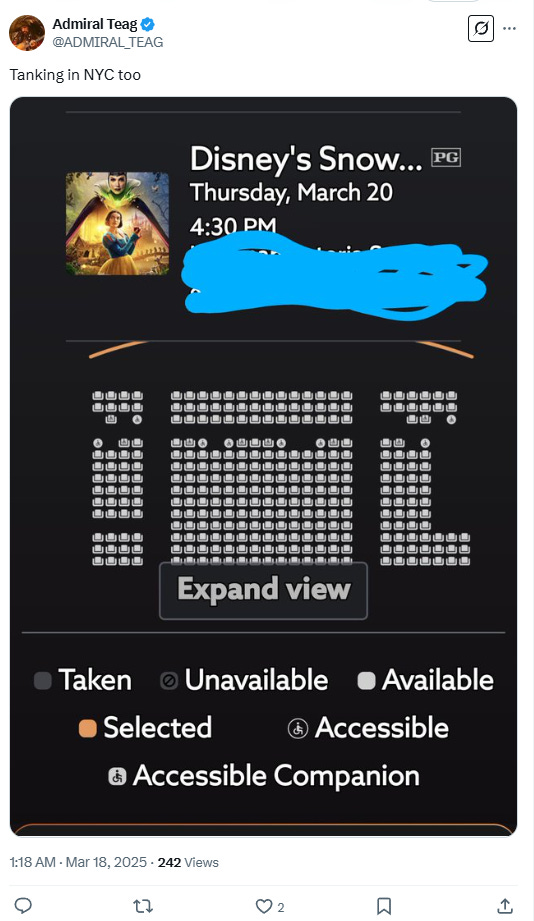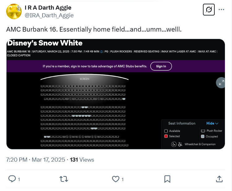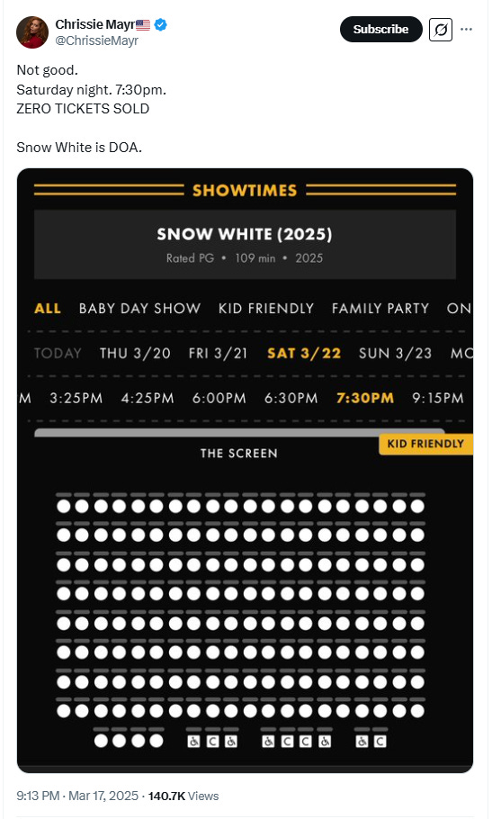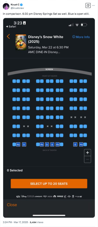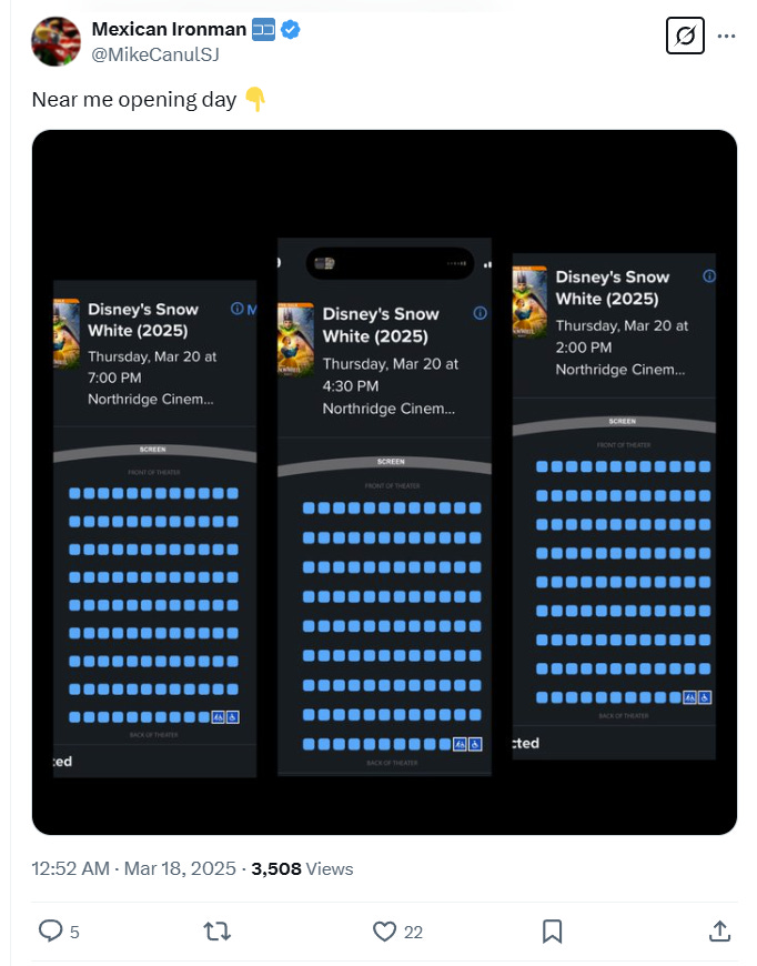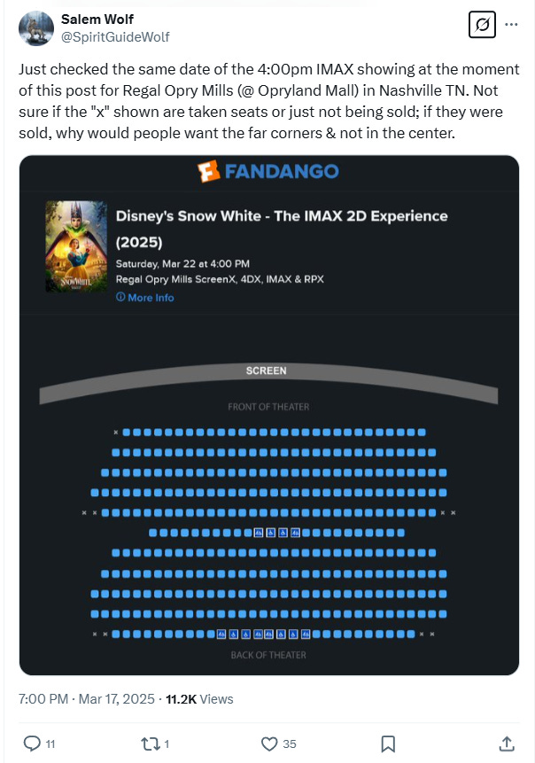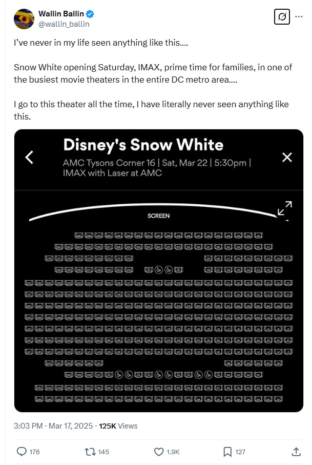 He wrote on X, “I’ve never in my life seen anything like this…. Snow White opening Saturday, IMAX, prime time for families, in one of the busiest movie theaters in the entire DC metro area…. I go to this theater all the time, I have literally never seen anything like this.”