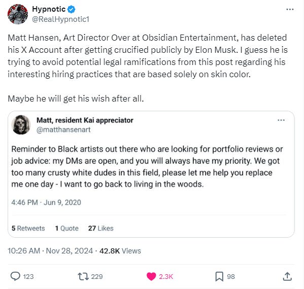 YouTuber Smash JT detailed a former employee at Obsidian reached out to him and shared a ton of information about the company’s culture as well as its Art Director Matt Hansen, who has openly admitted to discriminating against white men.