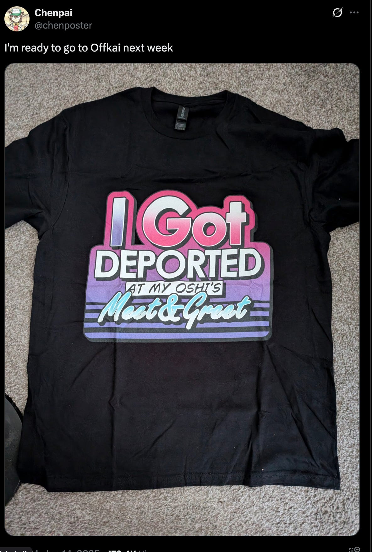 The controversy centers around a t-shirt reading "I got deported at my Oshi's meet and greet," a humorous reference to the convention's new requirement that attendees show government-issued ID to participate in VTuber meet and greets, that was posted by X user @chenposter. The shirt plays on current immigration enforcement efforts while poking fun at the convention's heightened security measures.