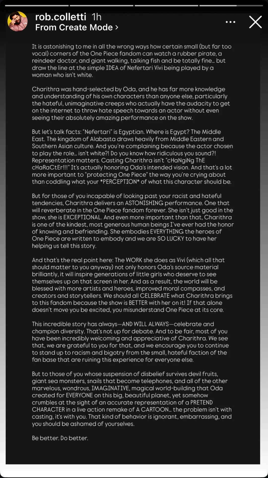 In response to these comments and others, Colletti posted a lengthy essay to his Instagram Stories. He began, “It is astonishing to me in all the wrong ways how certain small (but far too vocal) corners of the One Piece fandom can watch a rubber pirate, a reindeer doctor, and giant walking, talking fish and be totally fine… but draw the line at the simple IDEA of Nefertari Vivi being played by a woman who isn’t white.”