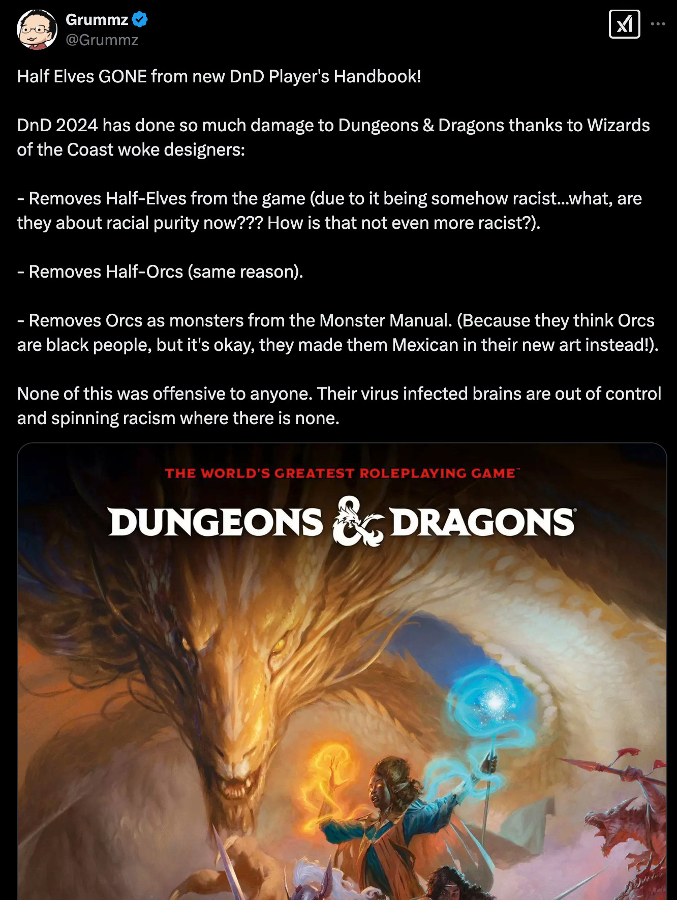 Former World of Warcraft lead designer Mark Kern aka Grumzz posted about all of the troubles this edition of D&D is having so far, saying, “Half Elves GONE from new DnD Player's Handbook! DnD 2024 has done so much damage to Dungeons & Dragons thanks to Wizards of the Coast woke designers: - Removes Half-Elves from the game (due to it being somehow racist...what, are they about racial purity now??? How is that not even more racist?). - Removes Half-Orcs (same reason). - Removes Orcs as monsters from the Monster Manual. (Because they think Orcs are black people, but it's okay, they made them Mexican in their new art instead!). None of this was offensive to anyone. Their virus infected brains are out of control and spinning racism where there is none.”