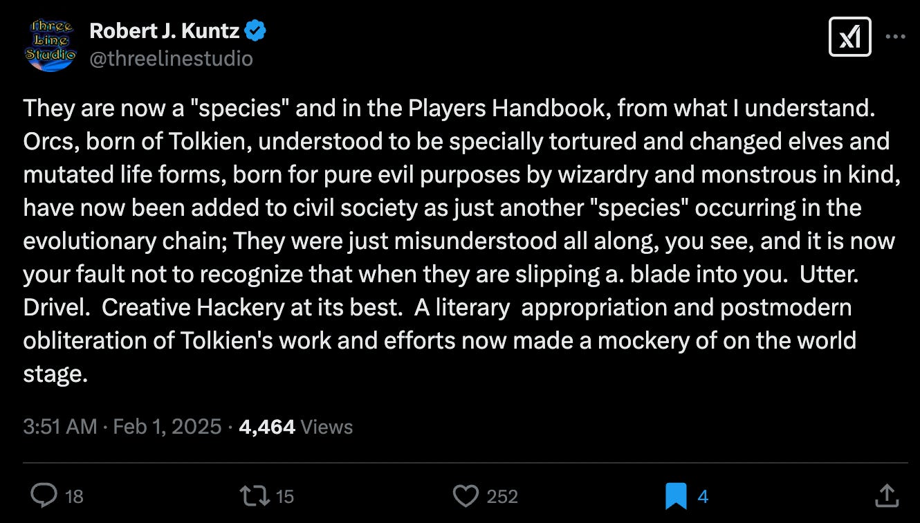 This prompted original D&D designer Robert J. Kuntz to give his impression of orcs from a classic perspective. He stated, “They are now a "species" and in the Players Handbook, from what I understand. Orcs, born of Tolkien, understood to be specially tortured and changed elves and mutated life forms, born for pure evil purposes by wizardry and monstrous in kind, have now been added to civil society as just another "species" occurring in the evolutionary chain; They were just misunderstood all along, you see, and it is now your fault not to recognize that when they are slipping a. blade into you. Utter. Drivel. Creative Hackery at its best. A literary appropriation and postmodern obliteration of Tolkien's work and efforts now made a mockery of on the world stage.”