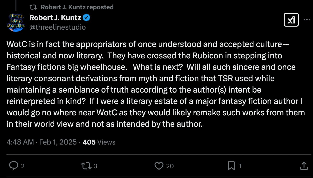 He clarified his disdain for what Wizards of the Coast has done with the game in another post, saying, “WotC is in fact the appropriators of once understood and accepted culture--historical and now literary. They have crossed the Rubicon in stepping into Fantasy fictions big wheelhouse. What is next? Will all such sincere and once literary consonant derivations from myth and fiction that TSR used while maintaining a semblance of truth according to the author(s) intent be reinterpreted in kind? If I were a literary estate of a major fantasy fiction author I would go no where near WotC as they would likely remake such works from them in their world view and not as intended by the author.”