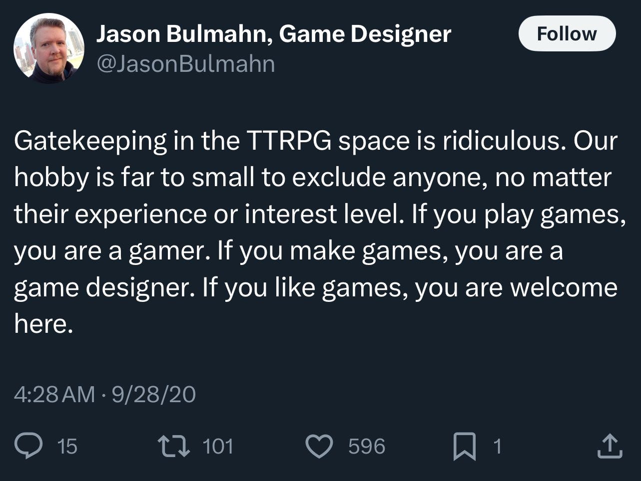 In 2020, Bulhman posted, “Gatekeeping in the TTRPG space is ridiculous. Our hobby is far too small to exclude anyone, no matter their experience or interest level. If you play games, you are a gamer. If you make games, you are a game designer. If you like games, you are welcome here.”