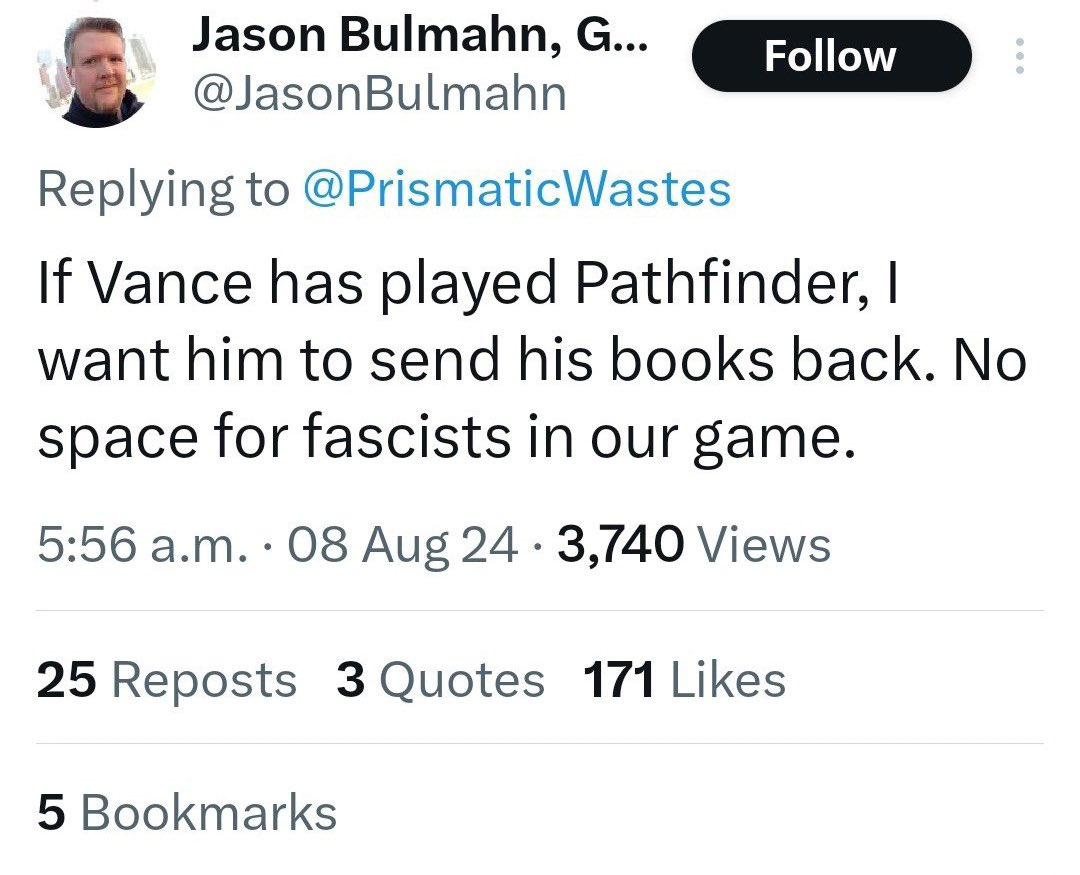 In 2024, however, he sang a different tune when he decided to gatekeep conservatives and Christians from Paizo prodcuts saying, “If Vance has played Pathfinder, I want him to send his books back. No space for fascists in our game.”