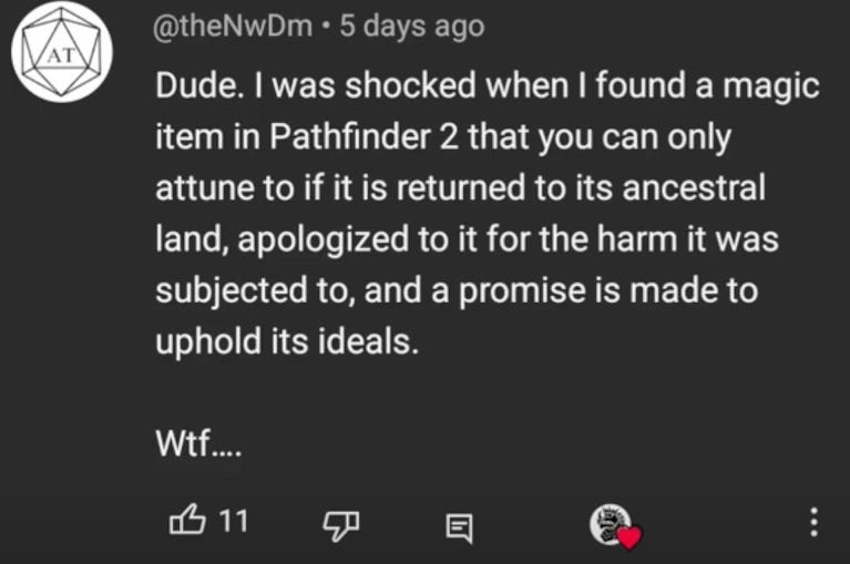 According to one player, there is even a magic item in Pathfinder 2, the new edition, that you can only attune to if it’s returned to its ancestral land, apologizing for the harm it was subjected to, and make a promise to uphold its ideals in an anti-colonialism in-game rant.