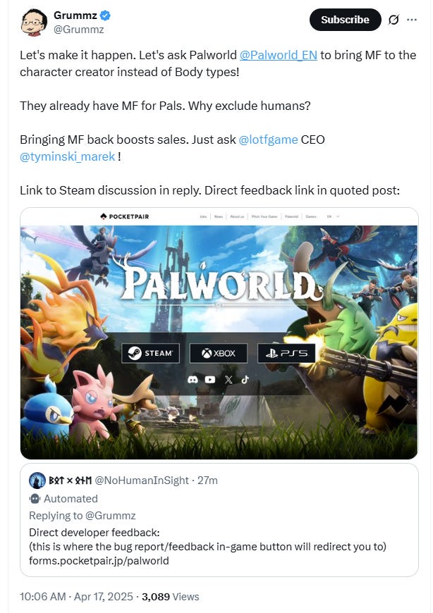 In another post he added, “Let's make it happen. Let's ask Palworld to bring MF to the character creator instead of Body types! They already have MF for Pals. Why exclude humans?”