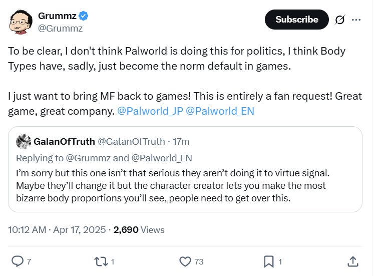 He posted, “To be clear, I don't think Palworld is doing this for politics, I think Body Types have, sadly, just become the norm default in games.”