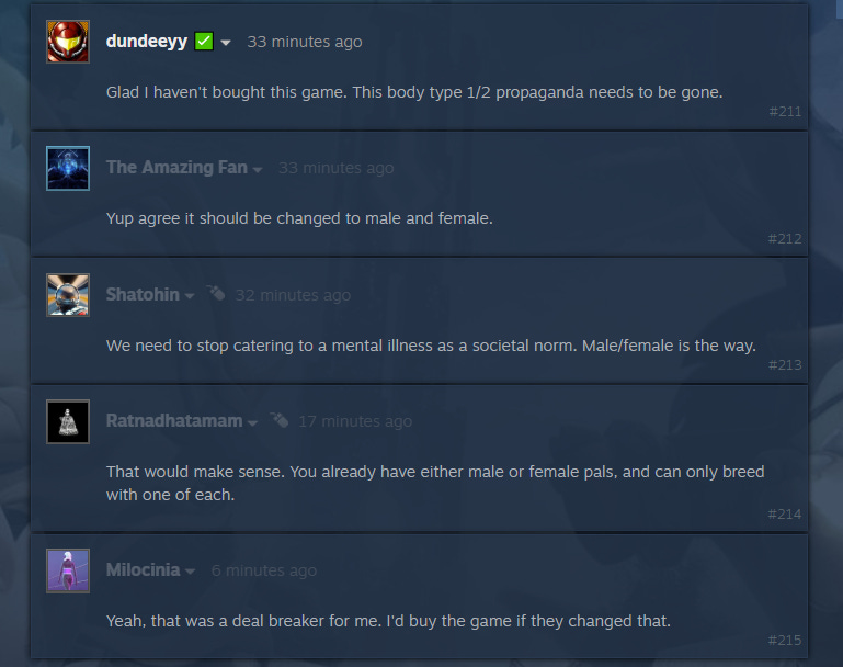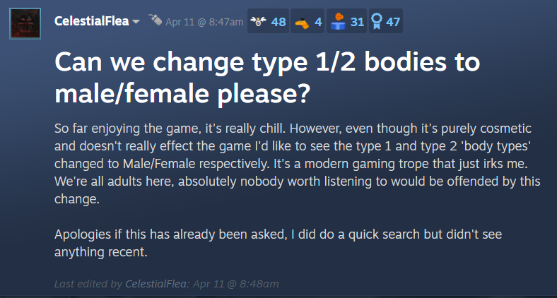 He explained, “So far enjoying the game, it's really chill. However, even though it's purely cosmetic and doesn't really effect the game I'd like to see the type 1 and type 2 'body types' changed to Male/Female respectively. It's a modern gaming trope that just irks me. We're all adults here, absolutely nobody worth listening to would be offended by this change.”