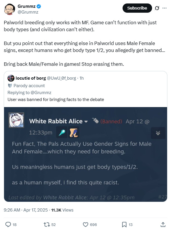 He wrote on X, “Palworld breeding only works with MF. Game can’t function with just body types (and civilization can’t either). But you point out that everything else in Palworld uses Male Female signs, except humans who get body type 1/2, you allegedly get banned… Bring back Male/Female in games! Stop erasing them.”