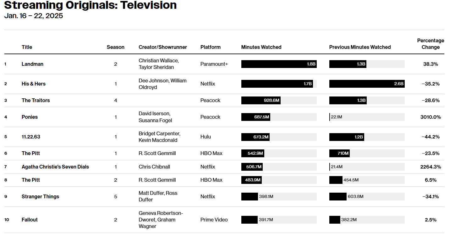 The show did not make Luminate’s top 10 chart for the week of January 16-22. The first two episodes premiered back on January 15th thus a majority of the watch time would have likely occurred in this week.