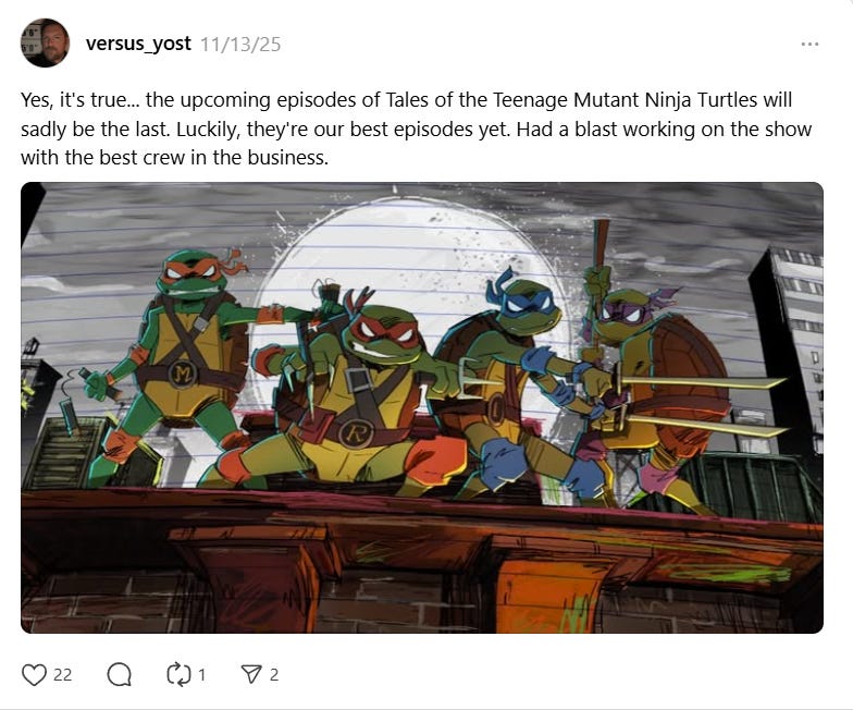 Showrunner Christopher Yost said in a post on Threads, “Yes, it’s true... the upcoming episodes of Tales of the Teenage Mutant Ninja Turtles will sadly be the last. Luckily, they’re our best episodes yet. Had a blast working on the show with the best crew in the business.”