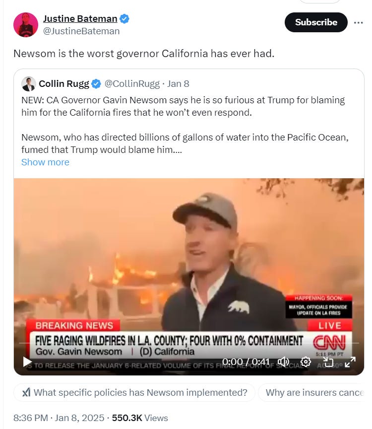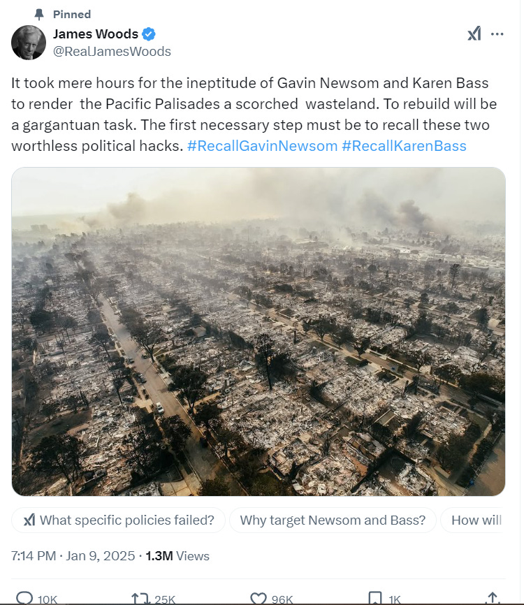 In a more recent post, he added, “It took mere hours for the ineptitude of Gavin Newsom and Karen Bass to render the Pacific Palisades a scorched wasteland. To rebuild will be a gargantuan task. The first necessary step must be to recall these two worthless political hacks. #RecallGavinNewsom #RecallKarenBass.”