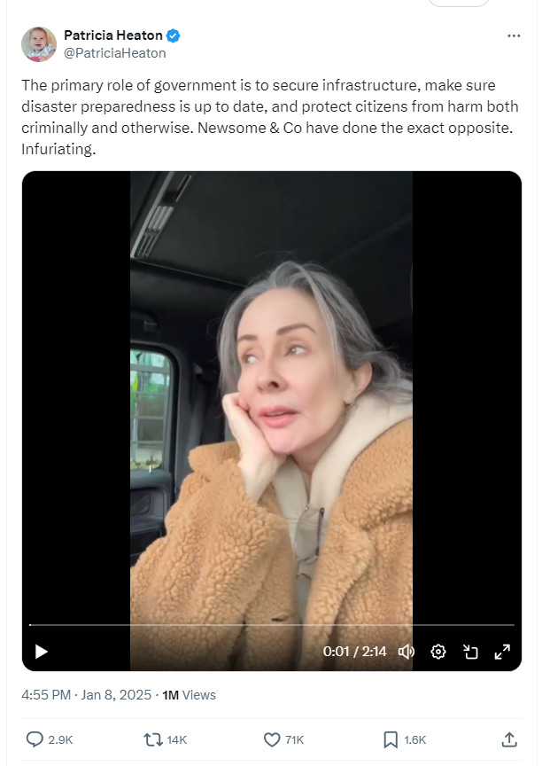 In a post X, Heaton wrote, “The primary role of government is to secure infrastructure, make sure disaster preparedness is up to date, and protect citizens from harm both criminally and otherwise. Newsome & Co have done the exact opposite. Infuriating.”