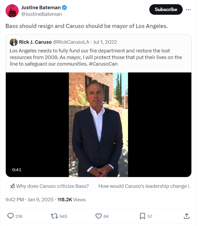 She also called on Bass to resign, “Bass should resign and Caruso should be mayor of Los Angeles.”