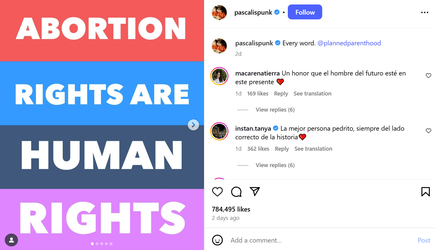 In a post to Instagram, Pascal shared a a number of images. One of them reads, “Abortion rights are human rights.”