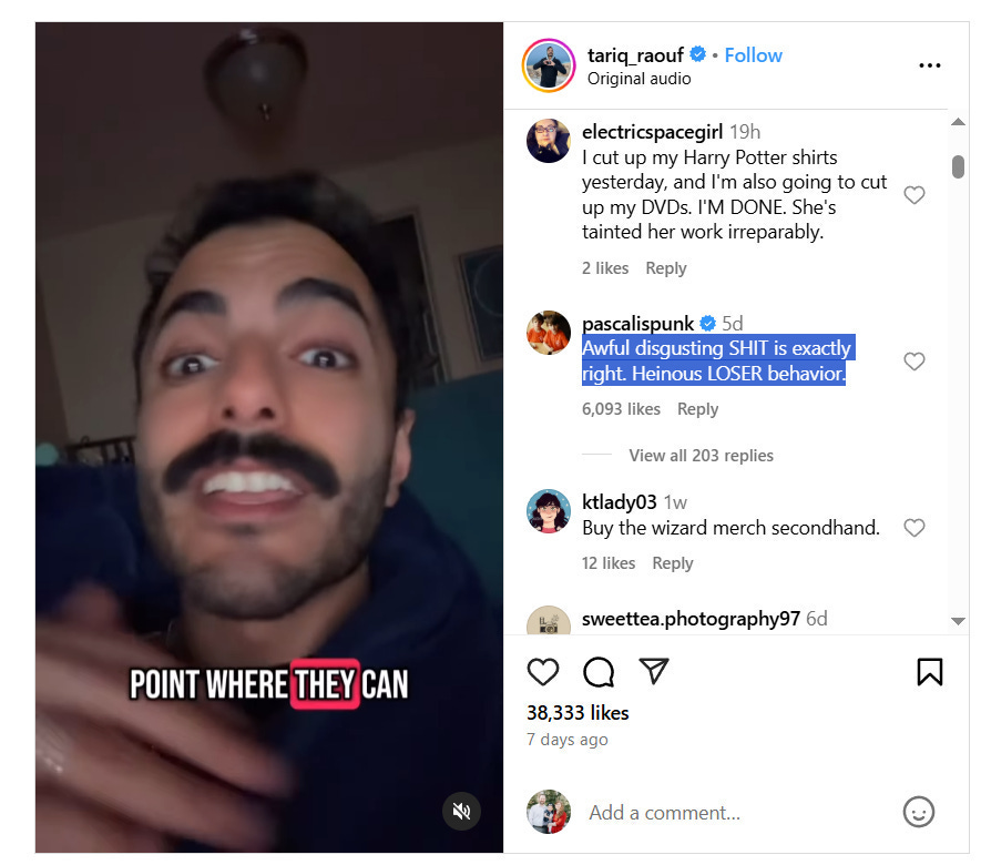 Pascal described Harry Potter novelist J.K. Rowling and her political and moral activism that is opposed to the wickedness of gender ideology as “Awful disgusting [expletive] is exactly right. Heinous LOSER behavior.”