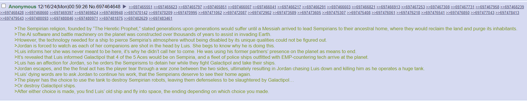 “Luis has an affection for Jordan, so he orders the Sempirisms to detain her while they fight Galactipol and take their ships,” it alleges. “Jordan escapes, and the the final act has the player tear through a war zone between the two sides, ultimately resulting in Jordan chasing Luis down and killing him as he operates a huge tank. Luis’ dying words are to ask Jordan to continue his work, that the Sempirians deserve to see their home again.”