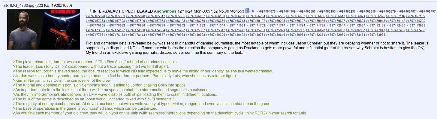 A 4Chan user shared a summary of the alleged leak and claimed it “was sent to a handful of gaming Journalists, the most notable of whom includes Jason Schreier, but they are debating whether or not to share it. The leaker is supposedly a disgruntled [Naughty Dog] member who hates the direction the company is going as Druckmann gets more powerful and influential (part of the reason why Schreier is hesitant to give the OK).”