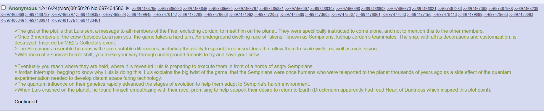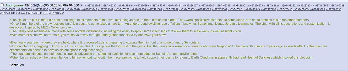 “Eventually you reach where they are held, where it is revealed Luis is preparing to execute them in front of a horde of angry Sempirians,” it states. “Jordan interrupts, begging to know why Luis is doing this. Luis explains the big twist of the game, that the Sempirians were once humans who were teleported to the planet thousands of years ago as a side effect of the quantam experimentation needed to develop distant space faring technology. When Luis crashed on the planet, he found himself empathizing with their race, promising to help support their desire to return to Earth (Druckmann apparently had read Heart of Darkness which inspired this plot point).”