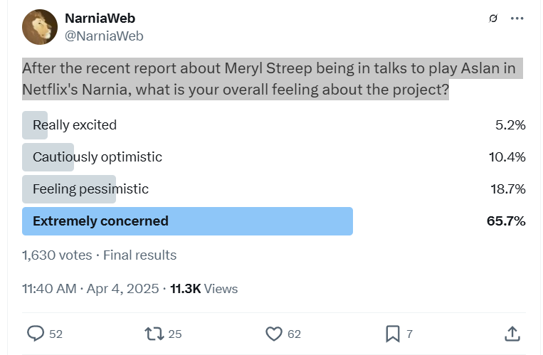 Narnia Web conducted the poll on X and asked its followers, “After the recent report about Meryl Streep being in talks to play Aslan in Netflix's Narnia, what is your overall feeling about the project?”