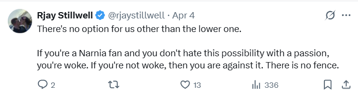 Rjay Stillwell also commented, “There's no option for us other than the lower one. If you're a Narnia fan and you don't hate this possibility with a passion, you're woke. If you're not woke, then you are against it. There is no fence.”
