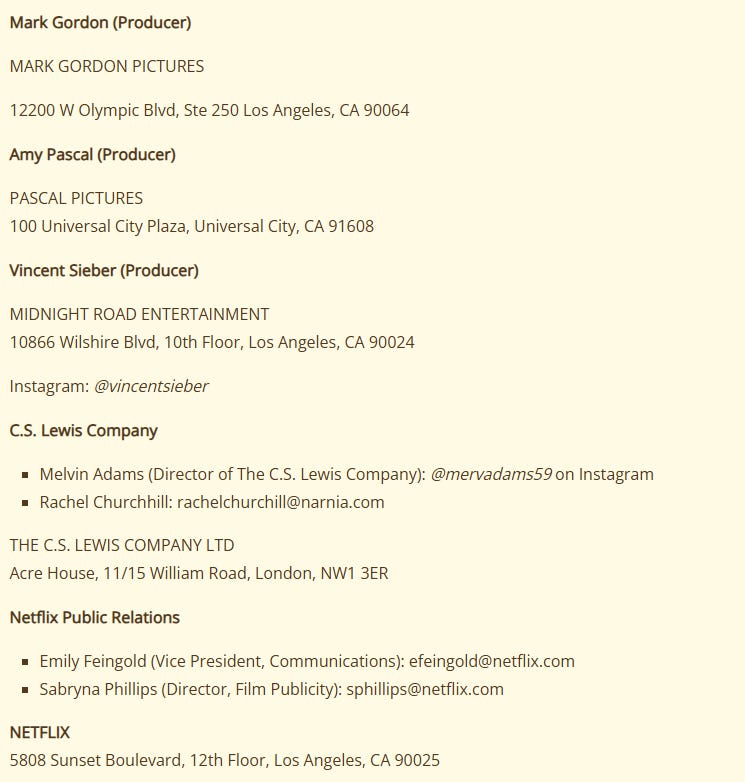 It then listed contact information for producers Mark Gordon, Amy Pascal, and Vincent Sieber. It also listed employees of the C.S. Lewis Company including Melvin Adams and Rachel Churchill.