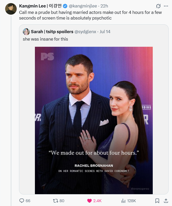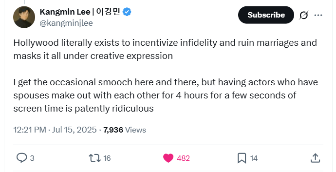 Kangmin Lee reacted to these comments writing on X, “Call me a prude but having married actors make out for 4 hours for a few seconds of screen time is absolutely psychotic.”