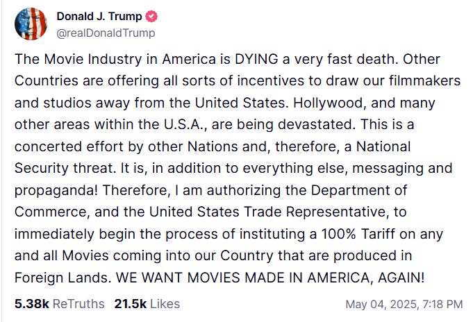 He then declared, “Therefore, I am authorizing the Department of Commerce, and the United States Trade Representative, to immediately begin the process of instituting a 100% Tariff on any and all Movies coming into our Country that are produced in Foreign Lands. WE WANT MOVIES MADE IN AMERICA, AGAIN!”