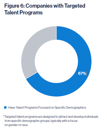 It also revealed that 67% of companies feature “talent programs such as mentorships, fellowships, internships and scholarships that focus on specific demographics.”