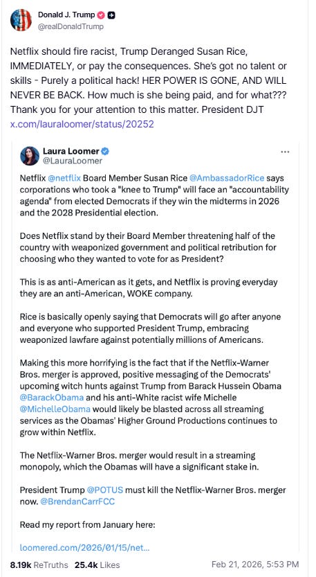 Trump posted to Truth Social writing, “Netflix should fire racist, Trump Deranged Susan Rice, IMMEDIATELY, or pay the consequences.”